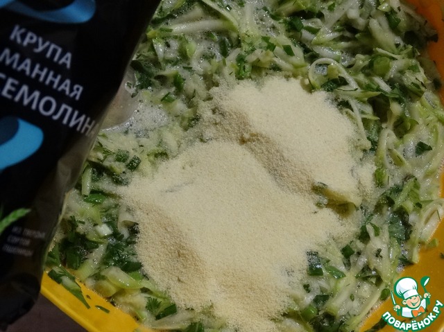 Добавляем яйца и семолину/манку, перемешиваем и даем постоять 10 минут. Мне нравится использовать в блюде семолину, она удерживает влагу, за счет чего запеканка получается очень нежной. Добавляем соль и муку, перемешиваем.