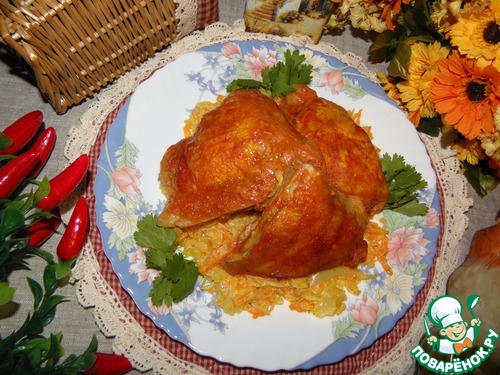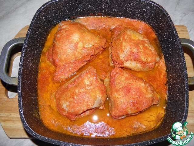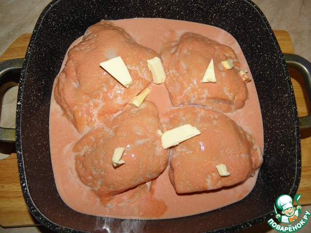 Выкладываем курицу в сотейник, или глубокую сковородку, заливаем розовым соусом (по желанию выкладываем наверх сливочное масло) Накрываем крышкой, доводим до кипения, и на маленьком огне тушим минут 50