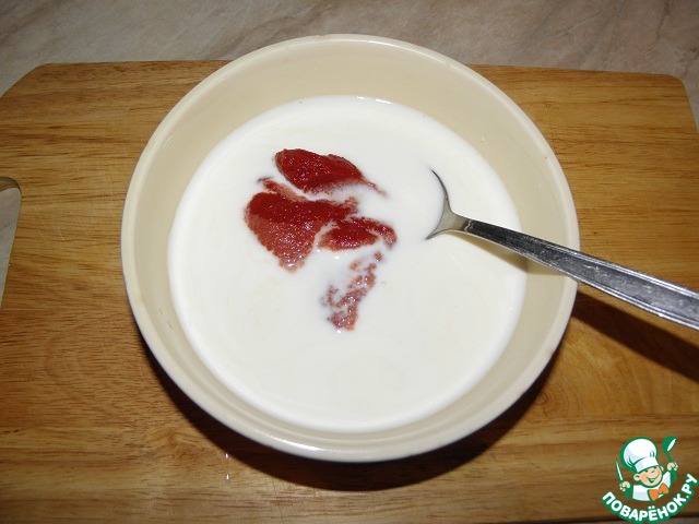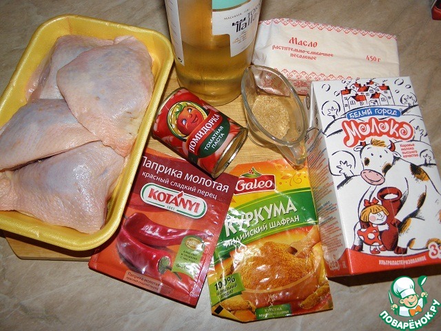 Курицу, если надо разделать на части, промыть, обсушить, подготовим соус: Молоко соединим с томатной пастой.