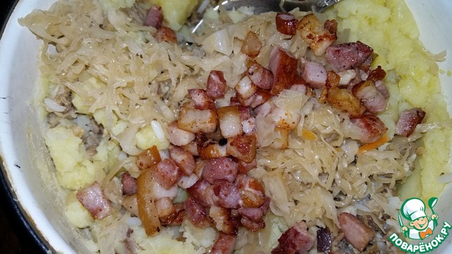 Квашенную капусту /у меня кисло-сладкая/ немножко потушить, мне нравится что бы в ней оставалась хрустинка.