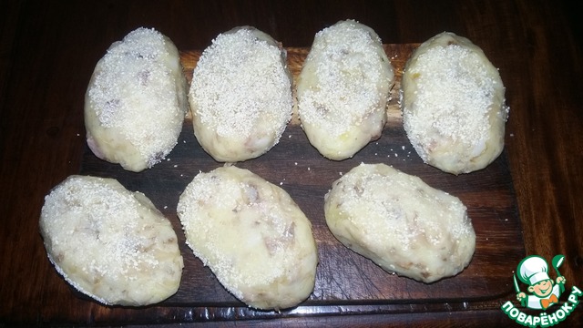 Бекон нарезать маленькими кусочками и обжарить. Соединить все ингредиенты. При необходимости добавить муки. У меня картошка с высоким содержанием крахмала и мне мука не понадобилась.