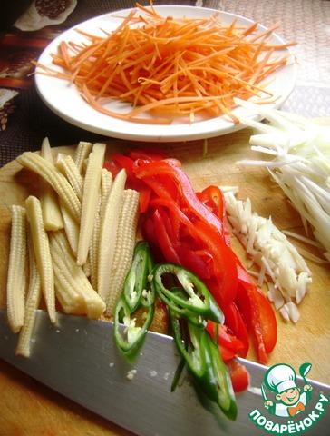 Овощи тонко нашинковать соломкой или натереть на корейской терке. Лук нарезать вдоль луковицы, чеснок измельчить соломкой. Початки мини кукурузы разрезать вдоль на четыре части, фасоль – если слишком длинная – нарезать помельче.