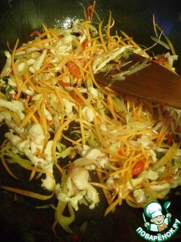 Пока рис обсыхает, приготовим филе с овощами. В воке разогреть растительное масло и быстро обжарить лук, морковь и перец, буквально минутку. Добавить филе и жарить, помешивая, до побеления мяса.