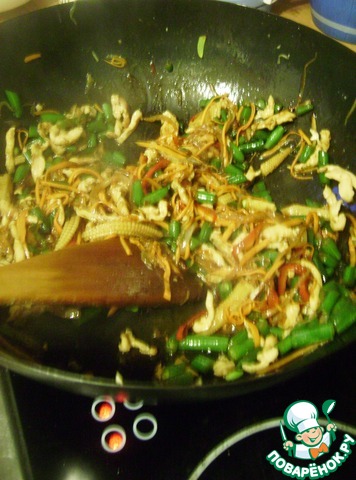 Добавить фасоль и кукурузу, полить соусом вок и жарить, помешивая, минуты три. Добавить чеснок, перемешать и выложить из вока.