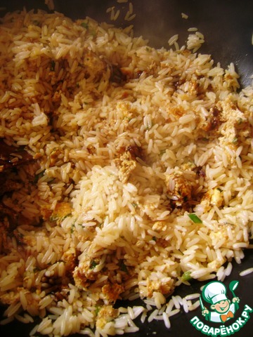 Выложить в яйца рис, полить соевым соусом и, интенсивно помешивая, обжарить все вместе до полной готовности яиц.