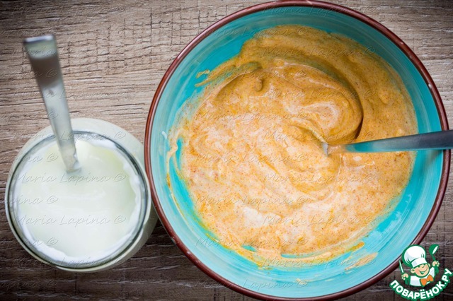 В миске смешаем готовый домашний йогурт, специи и чеснок