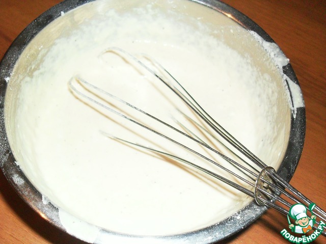 Массу еще раз перемешать венчиком. Тесто похоже на опару, как по мне. Или на тесто для оладий.