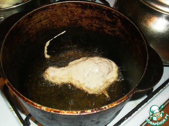 | Очень люблю экспериментировать с панировкой. Нашла этот рецепт в каком-то номере журнала "Отдохни" прошлого века.))) В панировке готовится не только курица, но и различные овощи. Можно хрустеть всем одновременно, а можно и по очереди. В рецепте предлагалось сделать в панировке кусочки филе, но у меня... что было-голени. Очень переживала, что не прожариться мясо у кости. Но напрасно. Все отлично прожарилось и мясо было очень сочным. |