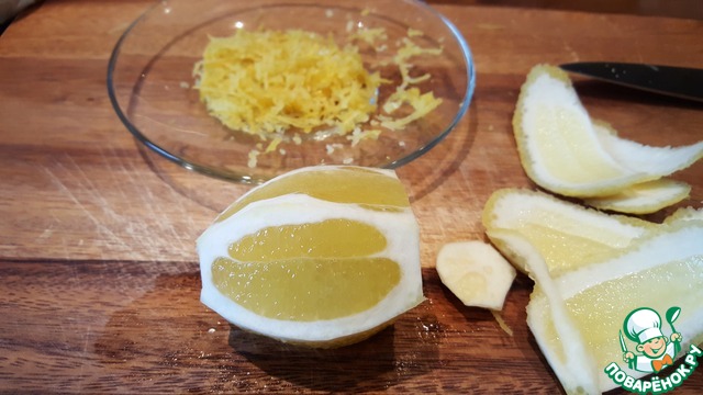 Снять цедру с лимона. Обрезать с лимона белую часть кожуры. Вынуть косточки и нарезать лимон тонкими ломтиками. У меня попался гипер кислый лимон и я полила ломтики лимона 1 ч. л. сиропа агавы.