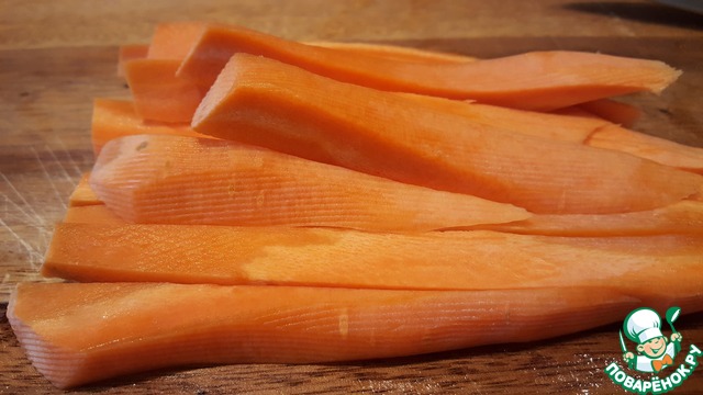 Морковь нарезать крупными брусочками. Белую часть лука порея и начало зелёной части нарезать на 4 части и по длине примерно как бруски моркови. Включить разогрев духовки 200*.