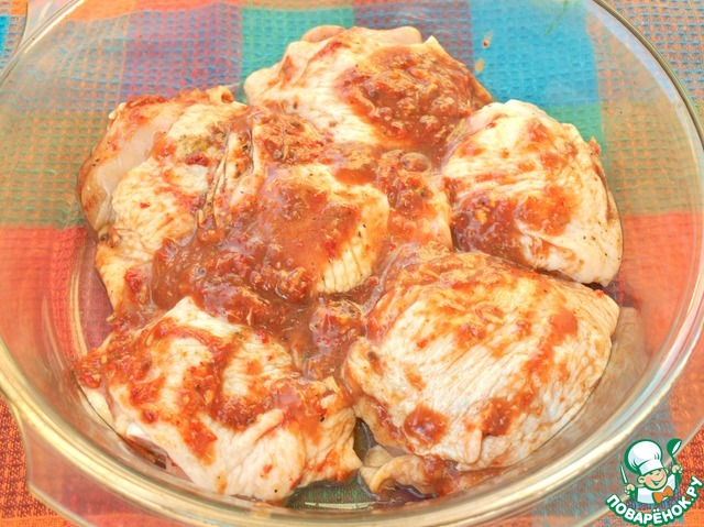 Смешать аджику и томатную пасту. Этой смесью хорошо намазать бёдра. Ёмкость с мясом накрыть крышкой и убрать в холодильник на 3-4 часа.