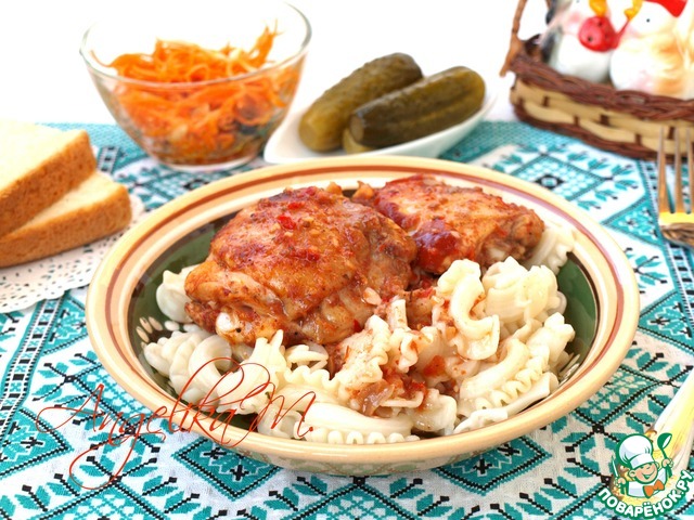 | Куриные бёдра, запечённые с аджикой - очень вкусное второе блюдо, которое подойдёт для завтрака или ужина. Бёдра можно приготовить и на праздничный стол. Я использовала домашнюю аджику средней остроты. |