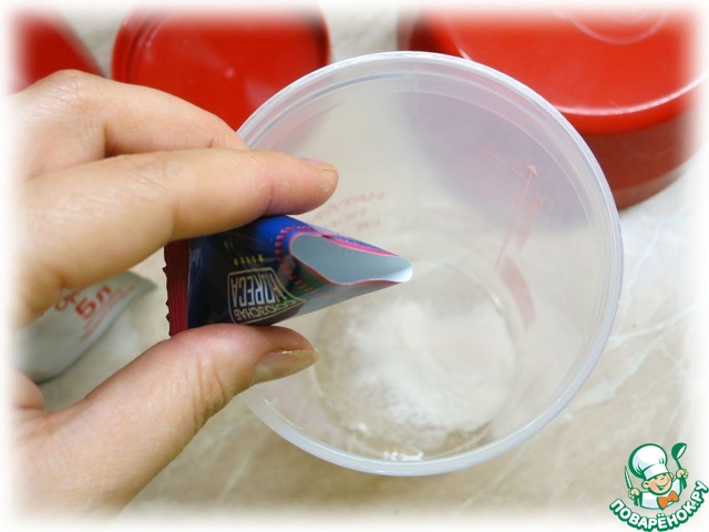 Обдать кипятком емкость для приготовления и всыпать туда порошок-закваску из порционного пакетика.