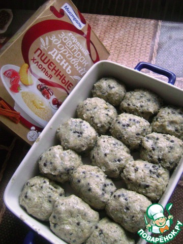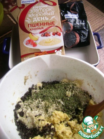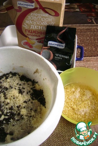 Стакан пшенных хлопьев «Мистраль» залить кипятком на пару минут. Лишнюю воду слить, остудить и добавить в фарш. Туда же добавить тертый сыр, вареную чечевицу белугу от «Мистраль».