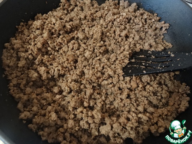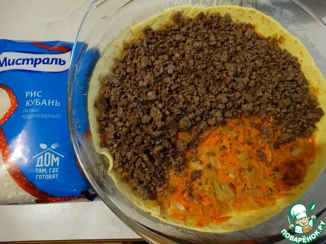 Первым слоем на лепешку укладываем морковь с луком, сверху обжаренный фарш.
