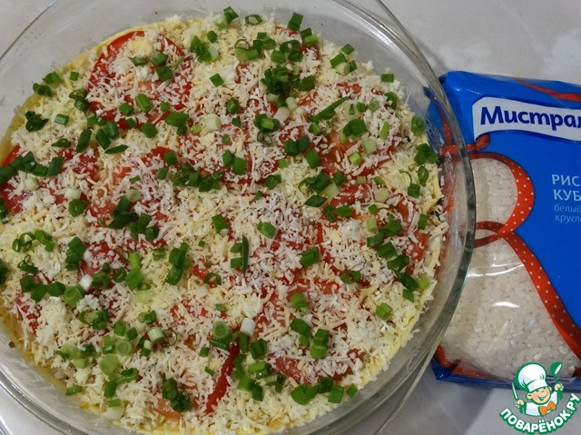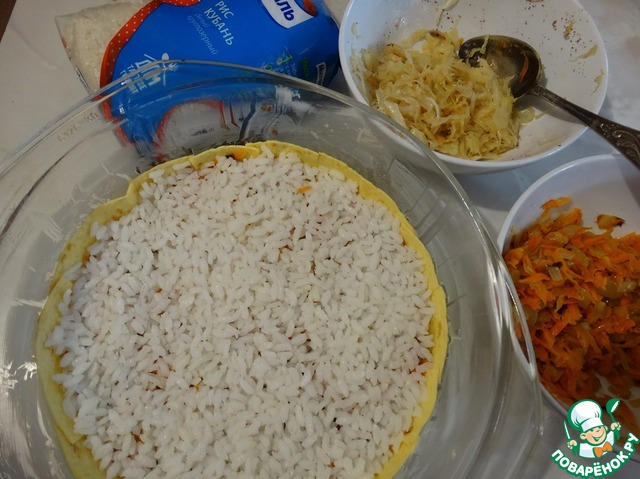 Затем рис, потом капусту. Заливаем половиной смеси молока и яиц, накрываем второй лепешкой и повторяем все слои еще раз. Поливаем оставшейся заливкой.