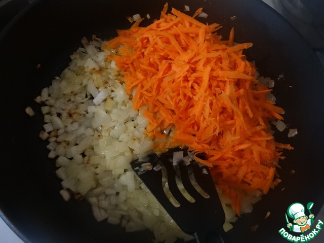 Во второй сковороде обжариваем лук с морковью, добавляя соль.