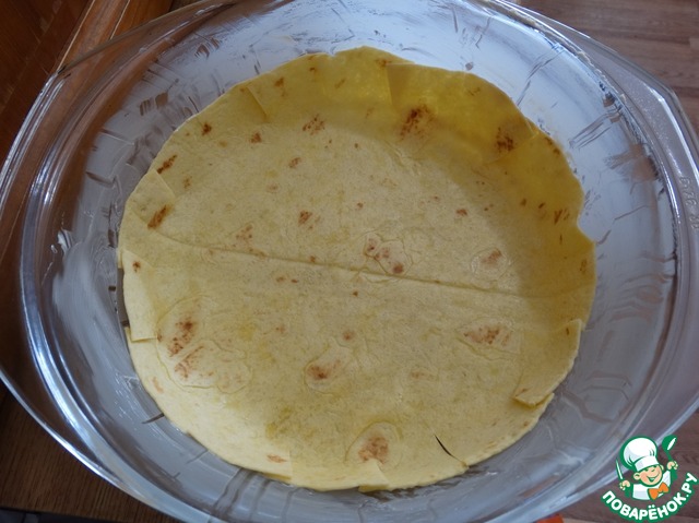 Форму смазываем сливочным маслом и укладываем первую лепешку. Так как диаметры лепешки и формы оказались разные, пришлось ее надрезать по краю лепестками и заложить немного внахлест. Лепешки не смазывала.