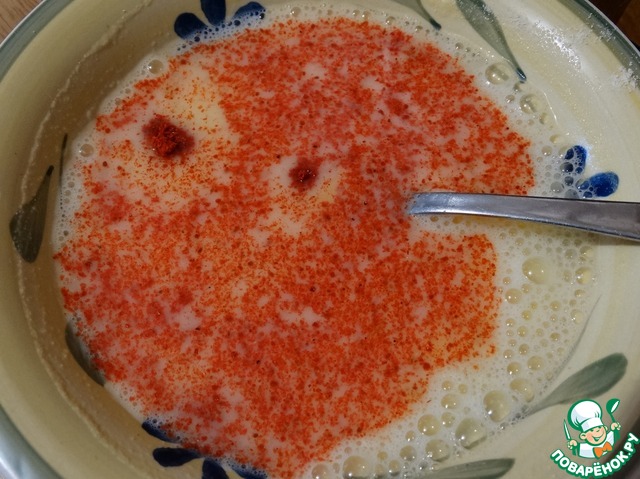 Готовим заливку. Взбиваем яйца с солью, паприкой и молоком, добавляем муку и размешиваем, чтобы не было комочков.