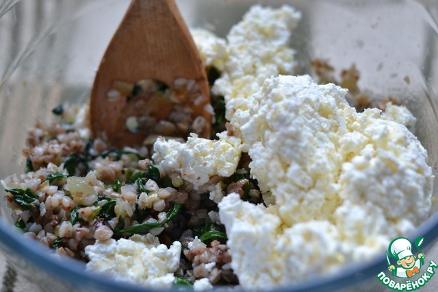 Добавить гречнево-шпинатную смесь к творогу с сыром.