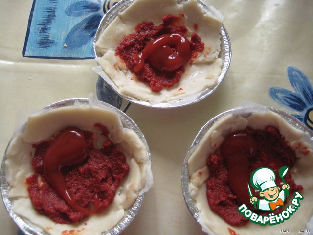 Кусочки песочного теста разложить в смазанные формочки для запекания, добавить томат.