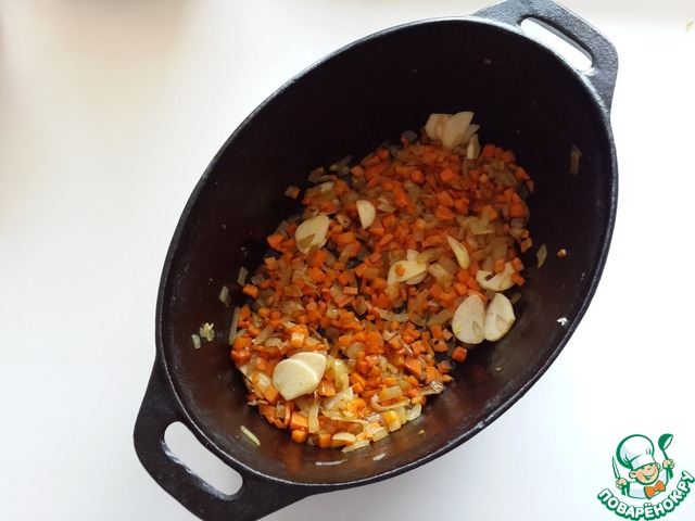Блюдо очень удобно запекать в глубокой форме. У меня чугунная утятница, можно взять глубокую керамическую форму. С бульона снимите жир, на этом жире поджарьте слегка лук и морковь, добавьте нарезанный "лепестками" чеснок