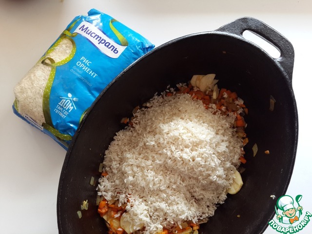 Длиннозерный рис "Ориент" от Мистраль хорошо промойте, дайте стечь воде и добавьте к овощам