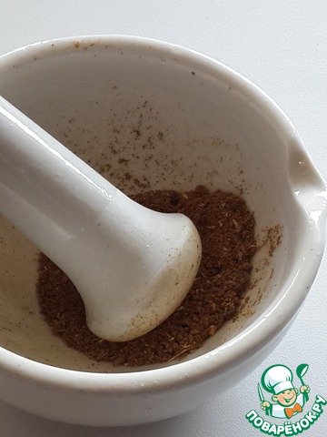 Специи возьмите по вкусу. Я взяла проверенную смесь для плова (перец черный, перец сладкий, кориандр, барбарис, зира, чабер). Измельчите специи в ступке