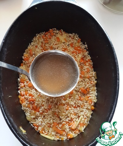 Разровняйте рис лопаткой, добавьте соль по вкусу и влейте бульон в соотношении 1:1,5. С солью акуратней, т. к. бульон уже посолен.