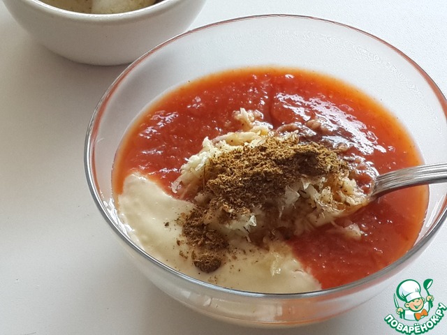 Смешайте всё для вкусной корочки (сметану, чеснок, аджику, сахар, табаско, специи)