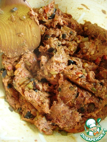 Добавить в фарш соффритто и рубленные маслины, хорошенечко вымешать и убрать на холод на полчаса.