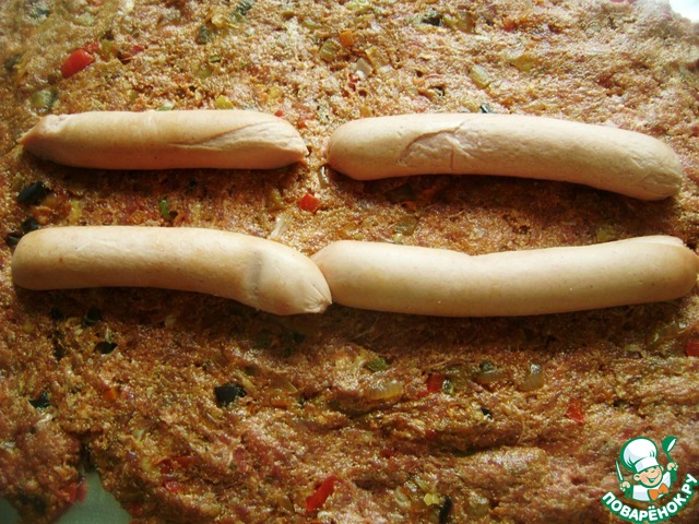 Готовый фарш разложить ровным слоем на лист фольги и уложить по центру сосиски. С помощью фольги аккуратно поднять край и свернуть плотный рулет.