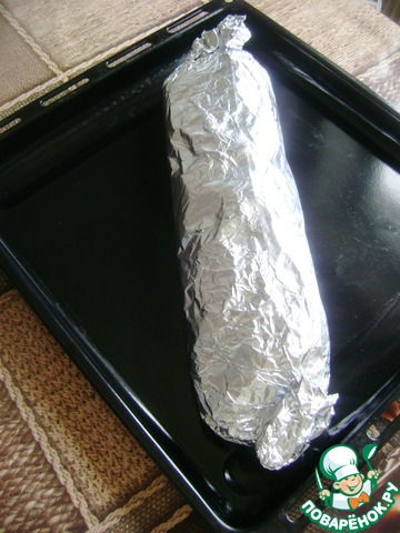 Закрутить края фольги, завернуть рулет во второй слой фольги и поставить запекать в разогретую до 200 градусов духовку минут на 45.