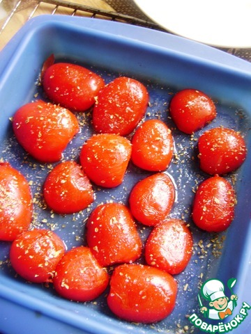 Минут за 15 до готовности поставить в духовку форму с половинками помидор, сбрызнутых оливковым маслом и посыпанных солью и сухими итальянскими травами. Запечь их до мягкости.