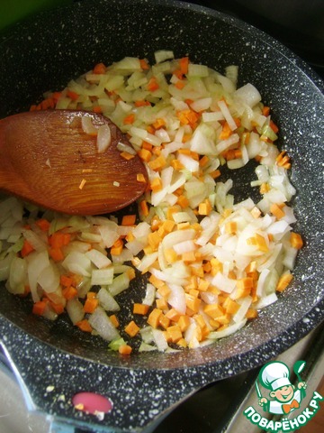 Разогреть масло в глубокой сковороде и на среднем огне спассеровать лук и морковь, помешивая и не давая румяниться.