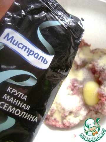 В фарш добавить семолину и яйца, посолить и вымешать. Дать постоять минут 10.
