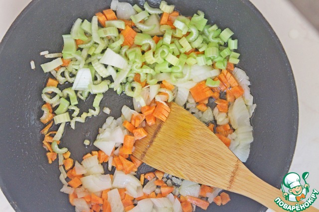 Для начинки обжарить на растительном масле мелко нарезанные лук, морковь и сельдерей. Обжаривать до мягкости пару мин.