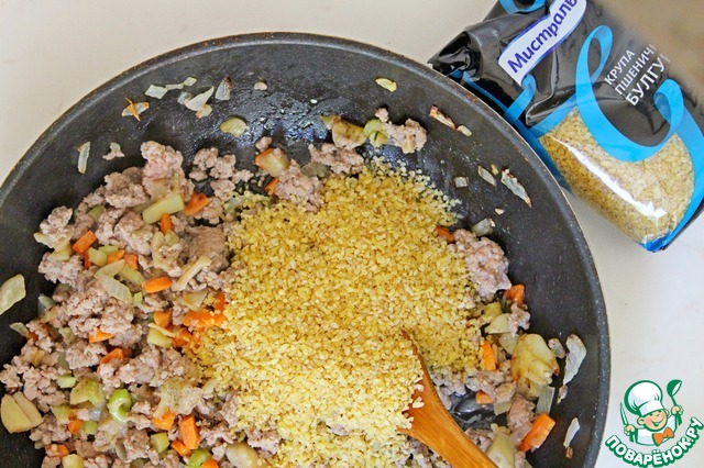 Добавить булгур ТМ "Мистраль", приправить начинку по вкусу и хорошо перемешать.