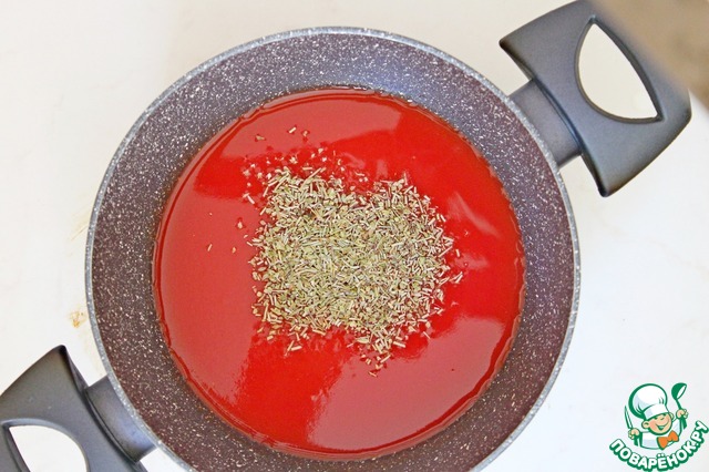 В кастрюлю влить томатный сок (можно из пакета магазинный), добавить соль, перец горошком, сахар, орегано сухой и довести до кипения.