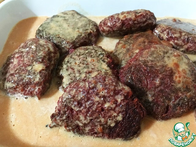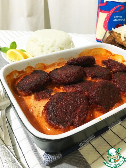 Готовим "соус" для заливки. Для этого смешиваем томатную пасту, острый соус чили, сметану и около стакана воды. Заливаем котлетки и ставим в микроволновку на средний огонь минут на 10. Можно протушить в духовке.