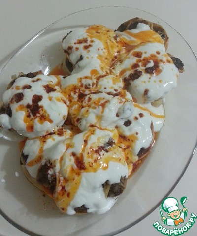 Готовим соус: растапливаем масло, добавляем красный острый перец и прогреваем на сковороде. Натуральный йогурт выливаем на манты, сверху поливаем смесью масла с перцем. Приятного аппетита!