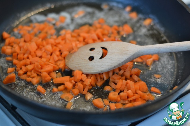 На сковороде растопить масло. Морковь мелко нарезать на кусочки и обжарить на масле. Прикрыть крышкой, притушить 5 минут.