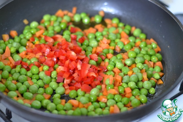 Зеленый горошек. И под конец, мелко нарезаный чеснок.