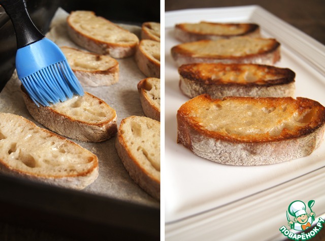 Чиабатту порезать, смазать оливковым маслом и поджарить в духовке под грилем.