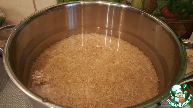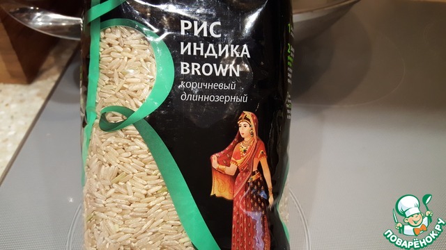 Рис. Промыть, залить холодной водой, довести до кипения, убавить огонь до небольшого и варить около 30 минут под плотно закрытой крышкой до полного впитывания воды. Всё по инструкции на упаковке, но воды я взяла немного меньше.