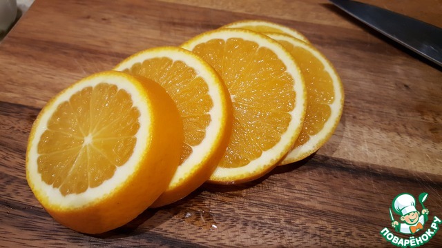 Далее один апельсин нарезаем кружочками, крайние корки выбрасываем.