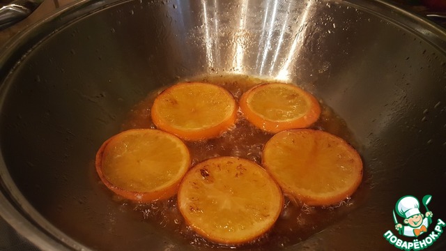Растапливаем в сковороде вок топлёное масло. Выкладываем кружочки апельсинов, накрываем крышкой. Будьте осторожны, апельсины сочные и можно обжечься!!! Обжариваем с обеих сторон и вынимаем кружочки апельсина.