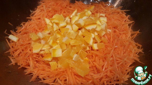 В вок, в масло, где обжаривался апельсин, закидываем морковь и апельсин, порезанный кубиком. На большом огне, постоянно помешивая, немного обжариваем.