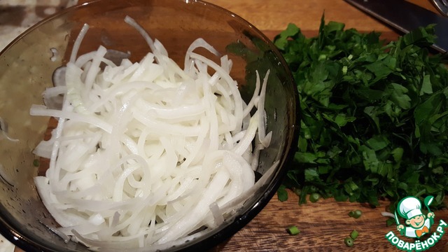 Добавляем сваренный рис, хорошо перемешиваем. Выключаем огонь и накрываем сковороду крышкой. Даём немного настояться. Нарезаем зелень. У меня петрушка. Лук, нарезанный полукольцами кладём в подходящую ёмкость, добавляем немного сахара и соль и взбрызгиваем белым винным уксусом. Оставляем немного настояться.