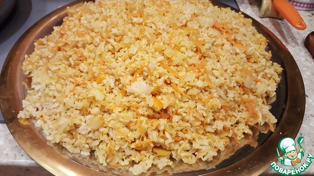 Собираем наше блюдо для подачи. На большое блюдо выкладываем рис с овощами.